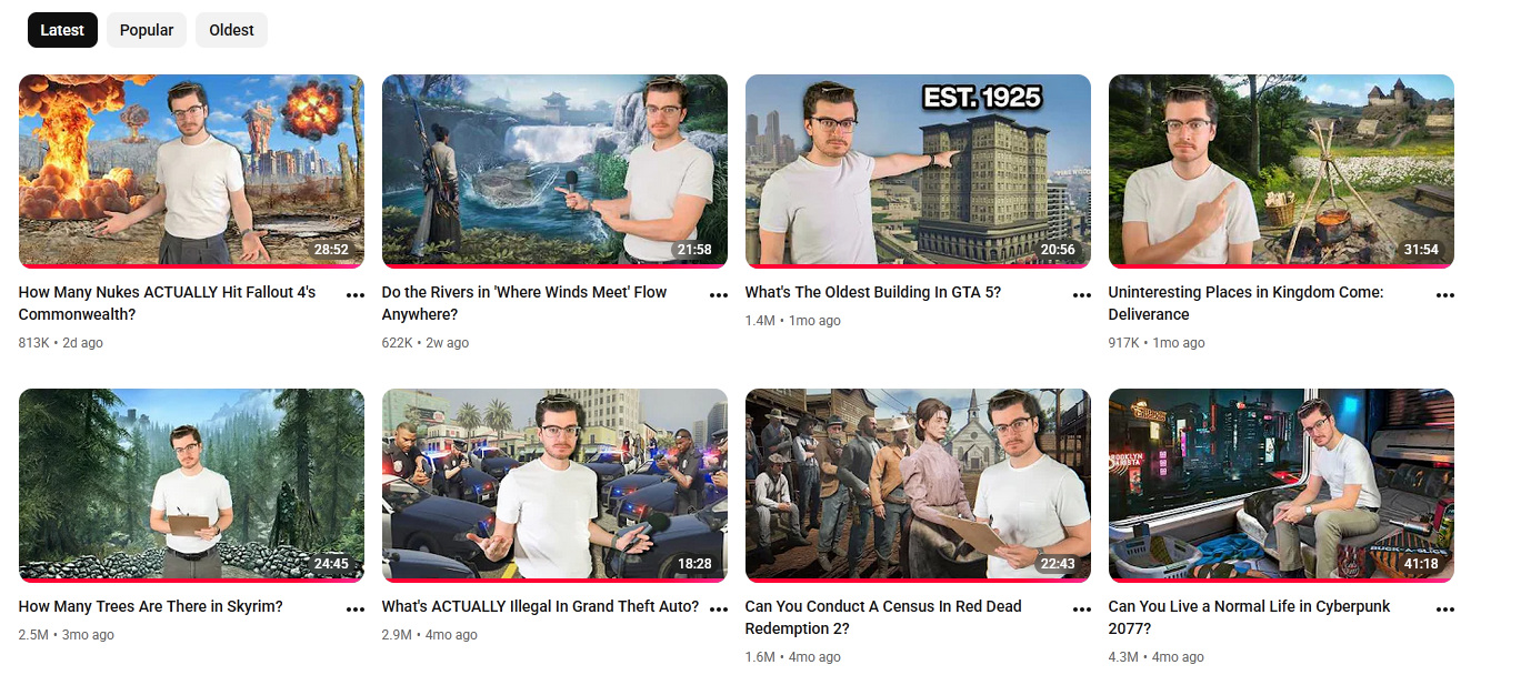 >>736919878I used to think this too, but really his videos stay in people's algorithms for longer and thus get much more views even over a course of weeks, that's why there is such a big difference between recent uploads and older ones