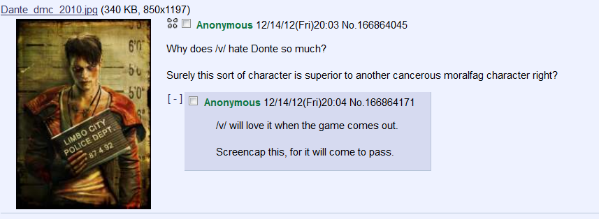 >>736934160William Shakespeare's 'DONTE'S INFORNICATION.'Scene II[Enter Donte, Demon, and Wubeth. Wubeth resounds in the background throughout.]Donte: "Hark! Thou must be the final component of this bilious villainy!"Demon: "Who art thou?"Donte: "I doth be thy courtier, thou abhorrent container of refuse!"Demon: "Who in the name of the beast with two backs art thou? BLEAUGHAUGH"Donte: "Behold, thou hast missed the mark! And my Christian name art Donte."Demon: "DONTE? Bastard of Sparda and Eva the concubine?!? BLEAUGHAUGH"Donte: "Yea verily! But thou mayest address me by my title: Donte, slayer of demons! Doth it not smell as sweetly as a rose?"Demon: "Thou seekest to slay me? Thou canst slay me! For a thousand and two hundred years I have drawn breath!"Donte: "Humorous, seeing as thy countenance begets a creature of twelve thousand!"Demon: "Fornicate thou!"Dante: "Fornicate THOU!"Demon: "Fornicate THOUUUUUUBLAUGHAUGH!"[WUBETH INTENSIFIES][End Scene]It's been over 13 years Jesus fucking Christ where is the time going, this place doesn't even feel like /v/ anymore, I miss when we had a proper culture and could laugh at terrible games instead of half of the threads being underage retards defending complete garbage