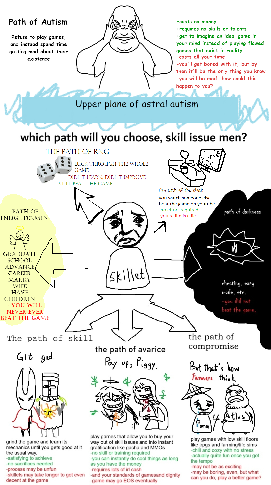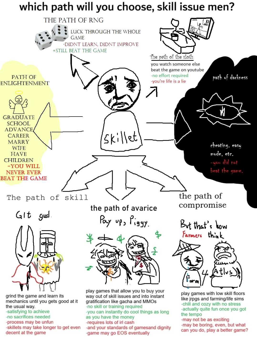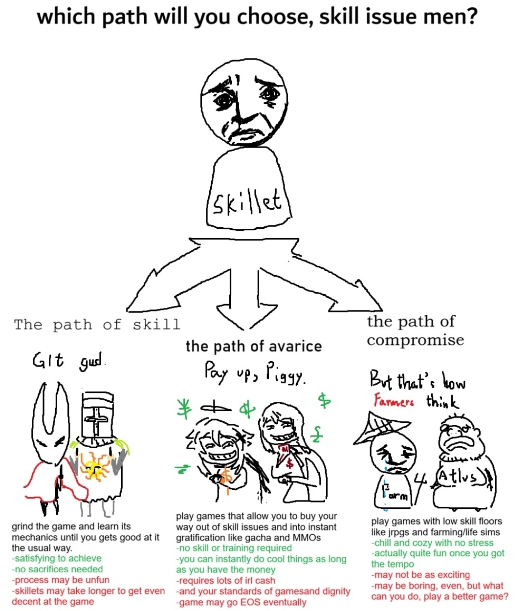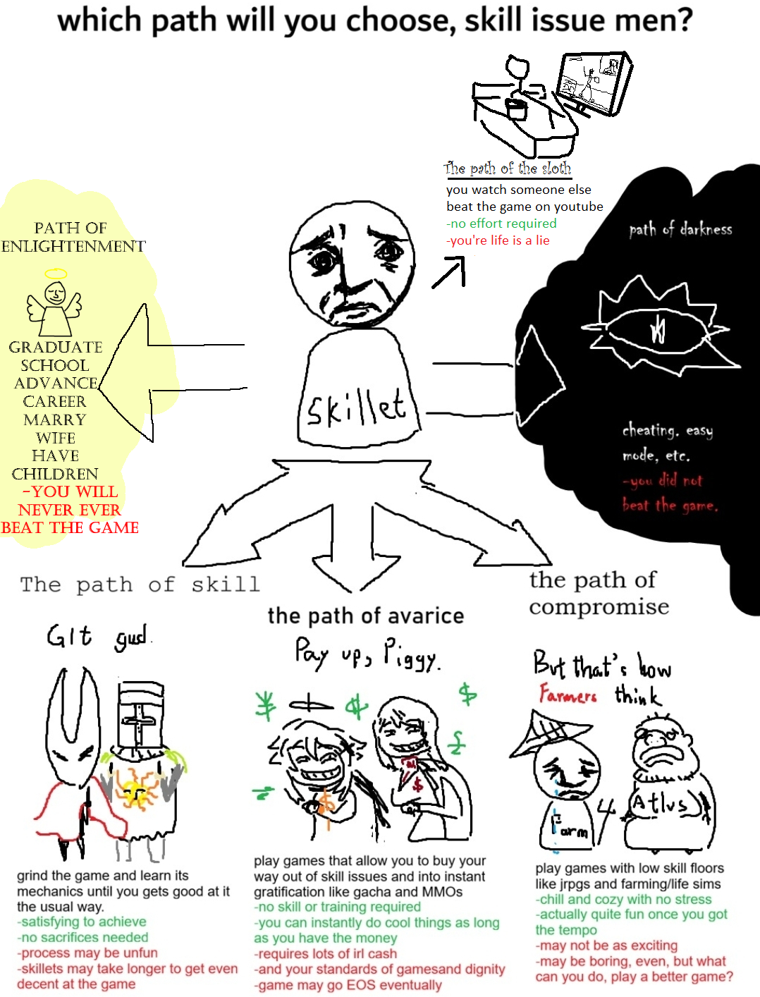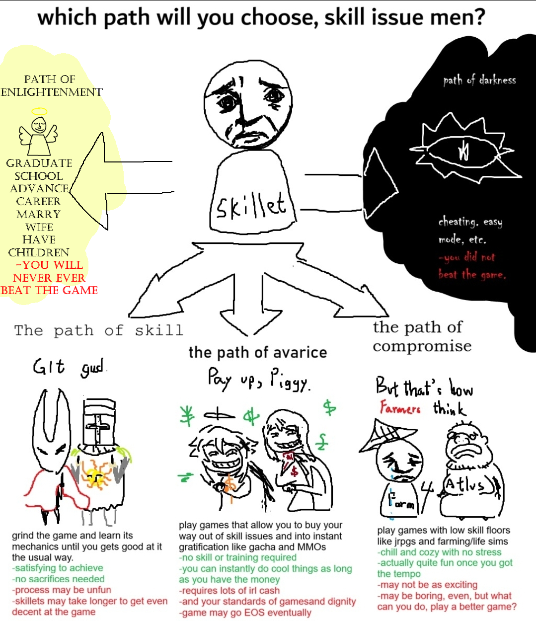 What a retarded and disingenuous image.>left pathDark souls and Shitsong are not difficult games. Women are beating these games on DDR pads. There's nothing satisfying about beating up an ai using pure memorization. They have no fluctuations to their patterns. It's the same few attacks repeated over and over on loop. >middle pathYou can't buy "power" in most mmos and gacha games. The ones you can aren't successful. The most popular MMOs make their money from selling cosmetics. Exceptions are some korean mmos(pay to avoid RNG(usually insurmountable RNG)) and games like Warframe(pay to advance quicker not necessarily become stronger) gacha games don't generally have any form of PvP and if they do it's a side thing the majority of the players either don't care about or don't touch. In all of these situations you can't "buy your way out of skill issues" because the skill floor for these games are so low to begin with that nothing changes. Even more so when taking things like raids into account that require more hours of memorizationslop.>right pathThe most retarded thing here by far. It's not even worth an actual breakdown. Only troons hate jrpgs.