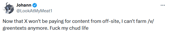 while you fags are shitting up a thread, i'm here to announce that x no longer does payouts for offsite 4chan screencaps/v/ will heal once more