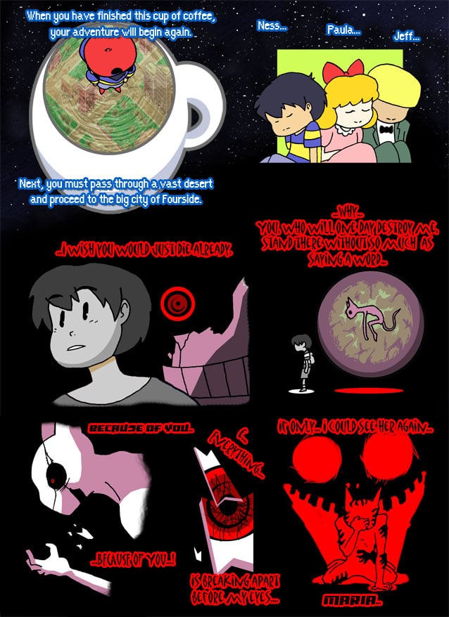 it's just being inspired, and i don't think being inspired is a bad thing if the end result can fully function as its own individual work. i don't know why people lose their minds and get all reductionist so they can say "This is LITERALLY just like that!" (it rarely is) when more or less every creative takes shit from elsewhere. the Mother series in particular isn't shy about it