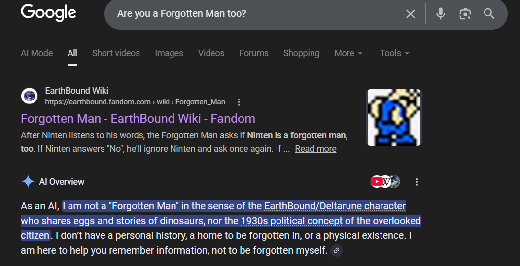 there's a character called the "Forgotten Man" in Deltarune, but he's sufficiently distinguished from Mother 1's Forgotten Man through context and presentation while functioning as a reference on top of that. if anything he's more of a Yume Nikki reference.