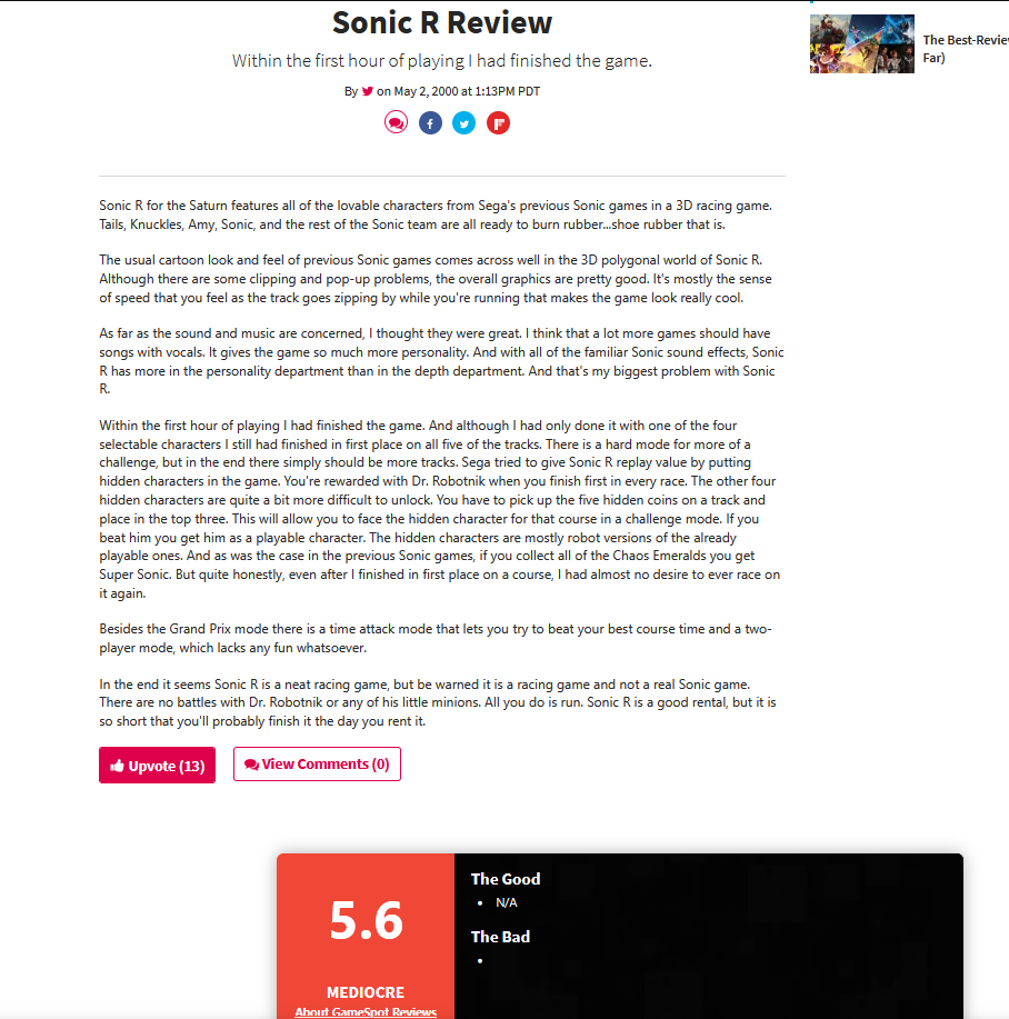 >>736958682>check old reviews on GameFAQs>IT'S BAD BUT.... THE POTENTIAL>BUT THE POTENTIAL>IT HAD POTENTIAL>IT ISN'T A GOOD SONIC GAME BUT...Nothing really has changed for Sonic has it?