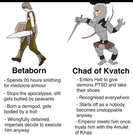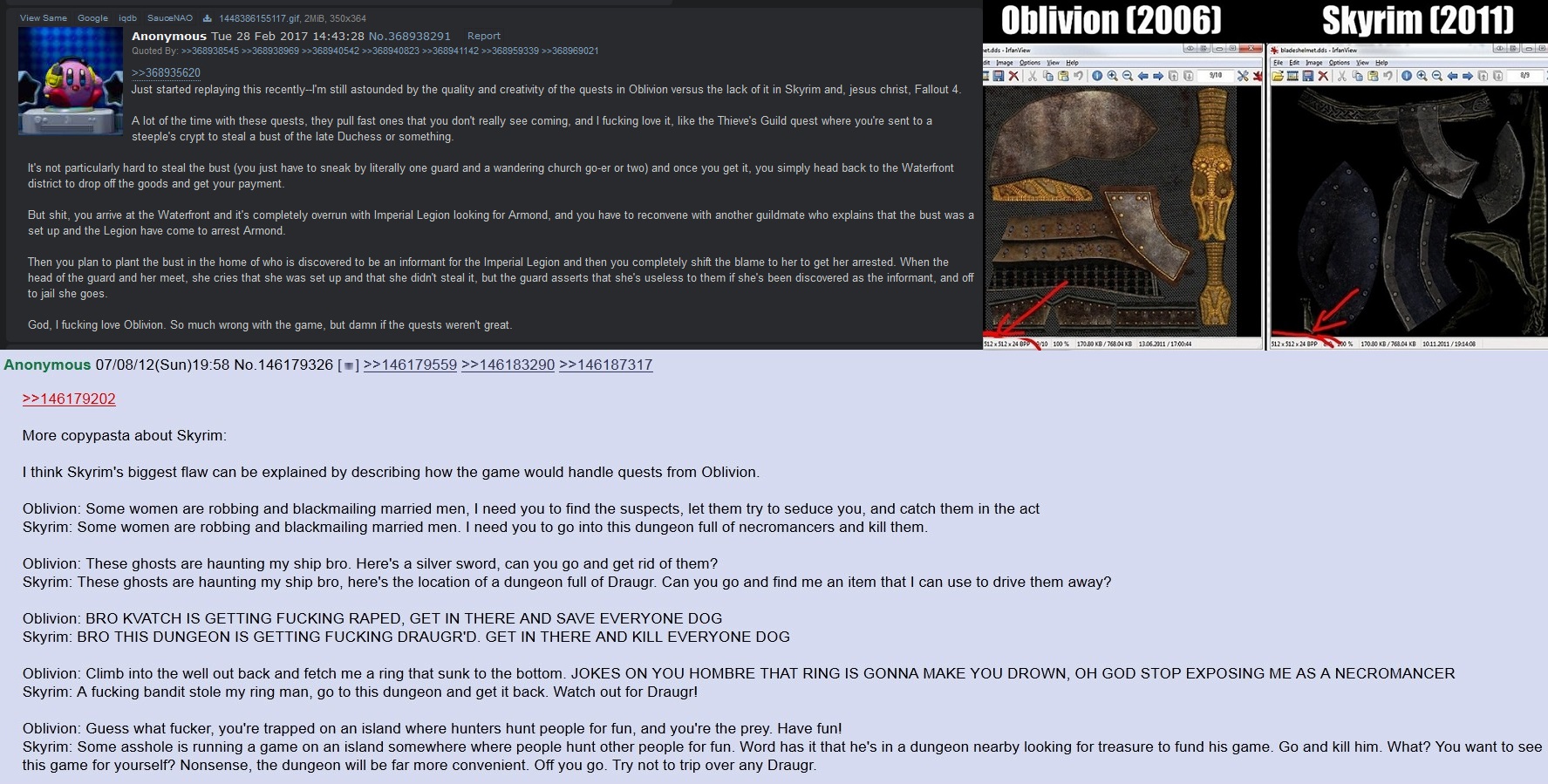 >>737006424>>737006601So just based upon the title alone you can tell Oblivion has a better defined story. It's about the oblivion crisis set in Cyrodill. So that's the point of the game. You know the story even before starting the game. Now skyrim. By the title alone you would think it's a story about skyrim and the province and it's people. Cool. Then what? You got dragonborn too. Right. So wbu skyrim? Is the story about skyrim? What are effects of the story upon skyrim? In oblivion they are very visible. In skyrim not so much. Alduin has no effect on skyrim besides destroying helgen and saving you. That's a shallow antagonist btw he literally saved you yet he is your enemy against people that don't care about you (ironic considering the premise of the story being skyrim)