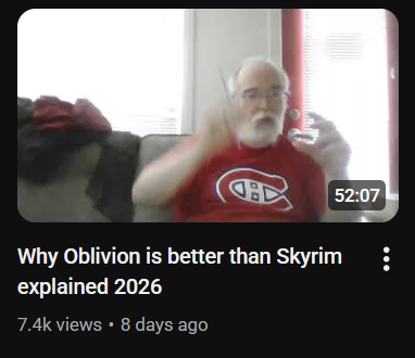 >>736978340LMAO saying anything other than Morrowind is peak contrarianism. This thread is full of low-quality bait. Notice how the majority of these self-proclaimed Oblivion and Skyrim fans are just shitposting, these people are not being genuine.