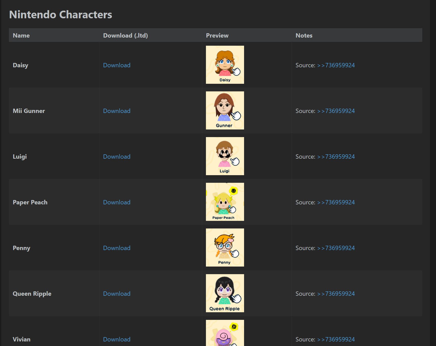 >>736958267This is the closest thing I've seen so far. Shame, because I'd love to grab some miis.https://rentry.org/some_ltd_miis/