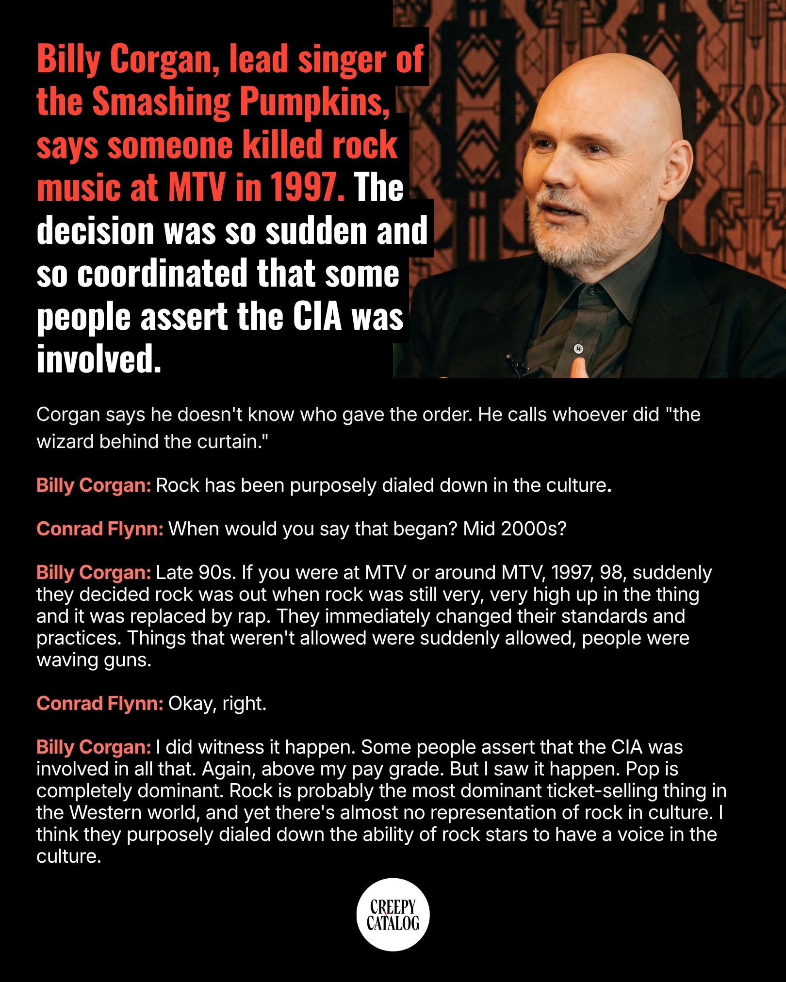 >>736971152no, the point is that billy thinks his opinion is more valuable and should be worth listening to strictly because he is a rock star and he's claiming the cia pulled a hit on the entire genre so people wouldn't value his opinions over others. He thinks he's inherently better than you and worth listening to because he sings in a band