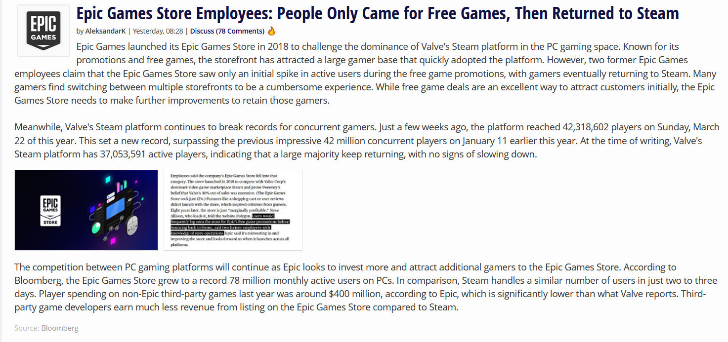 I think this is really funny because the idea of 'the platform that provides a better service gets more users' is so foreign to people in the games industry that epic has a melt down over it.