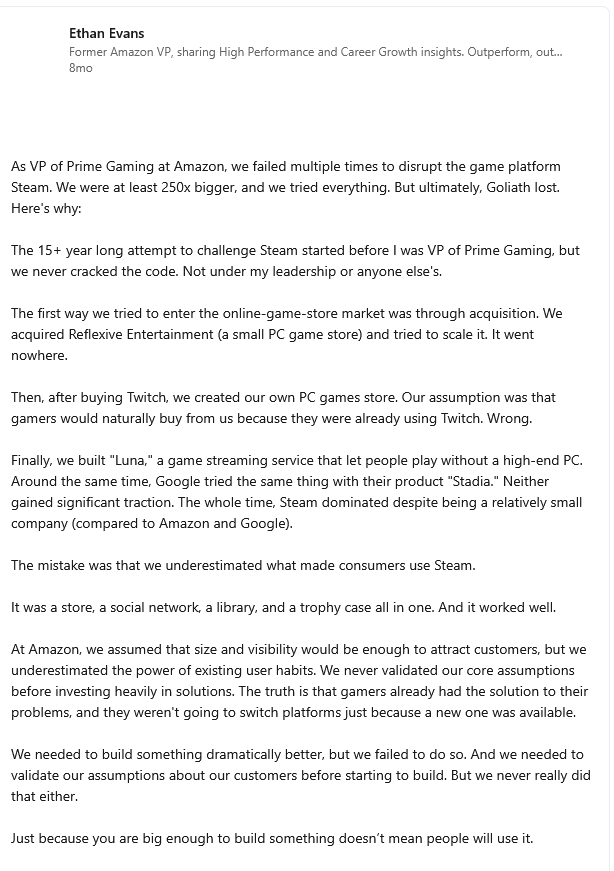 Another thing I don't see discussed is that Steam is an entire ecosystem that people can create a persona for. The Epic Games launcher is just some shit you have to click through to play Fortnite or GTA or something. Epic just doesn't get it and neither does anyone else apparently.