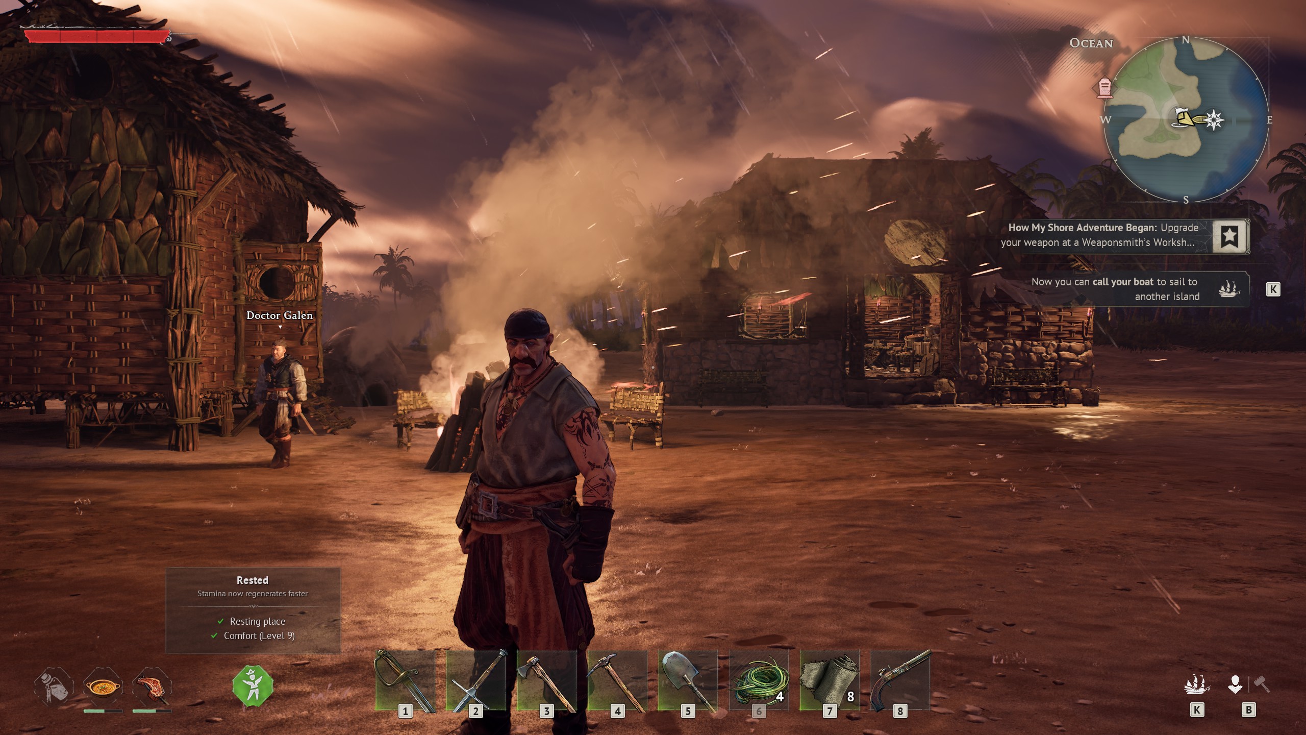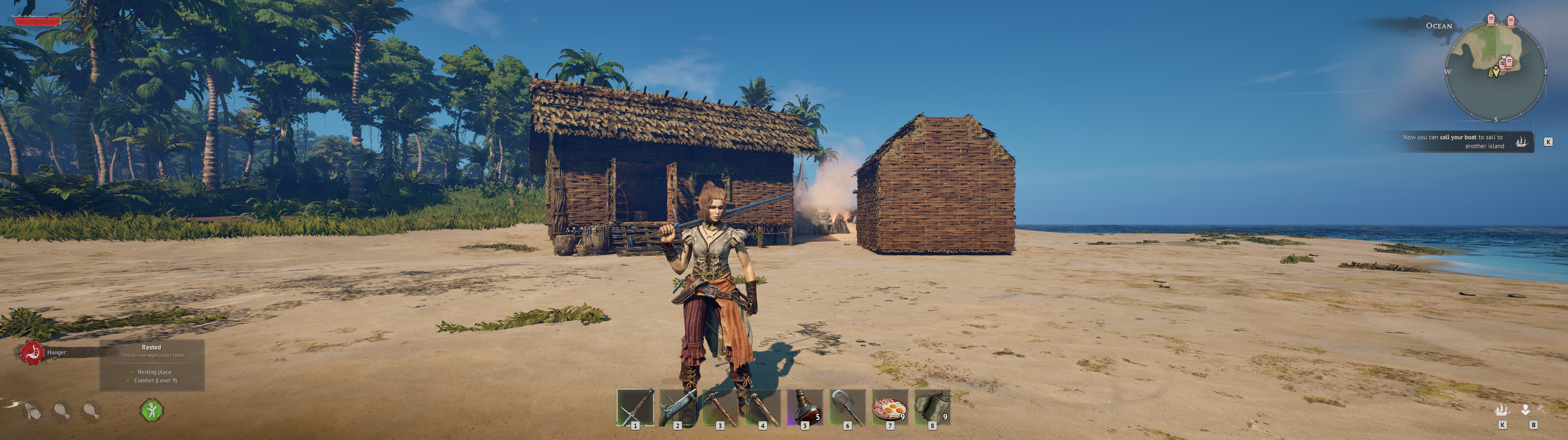 I set up my camp and got some copper gear before going to sleep. peak comfy. havent even used my boat yet, still on tutorial island. Also, note you can craft stuff with the mats if they are in storage, you dont have to carry 1000 plant fiber to craft at a table for example. Very nice QOL stuff.
