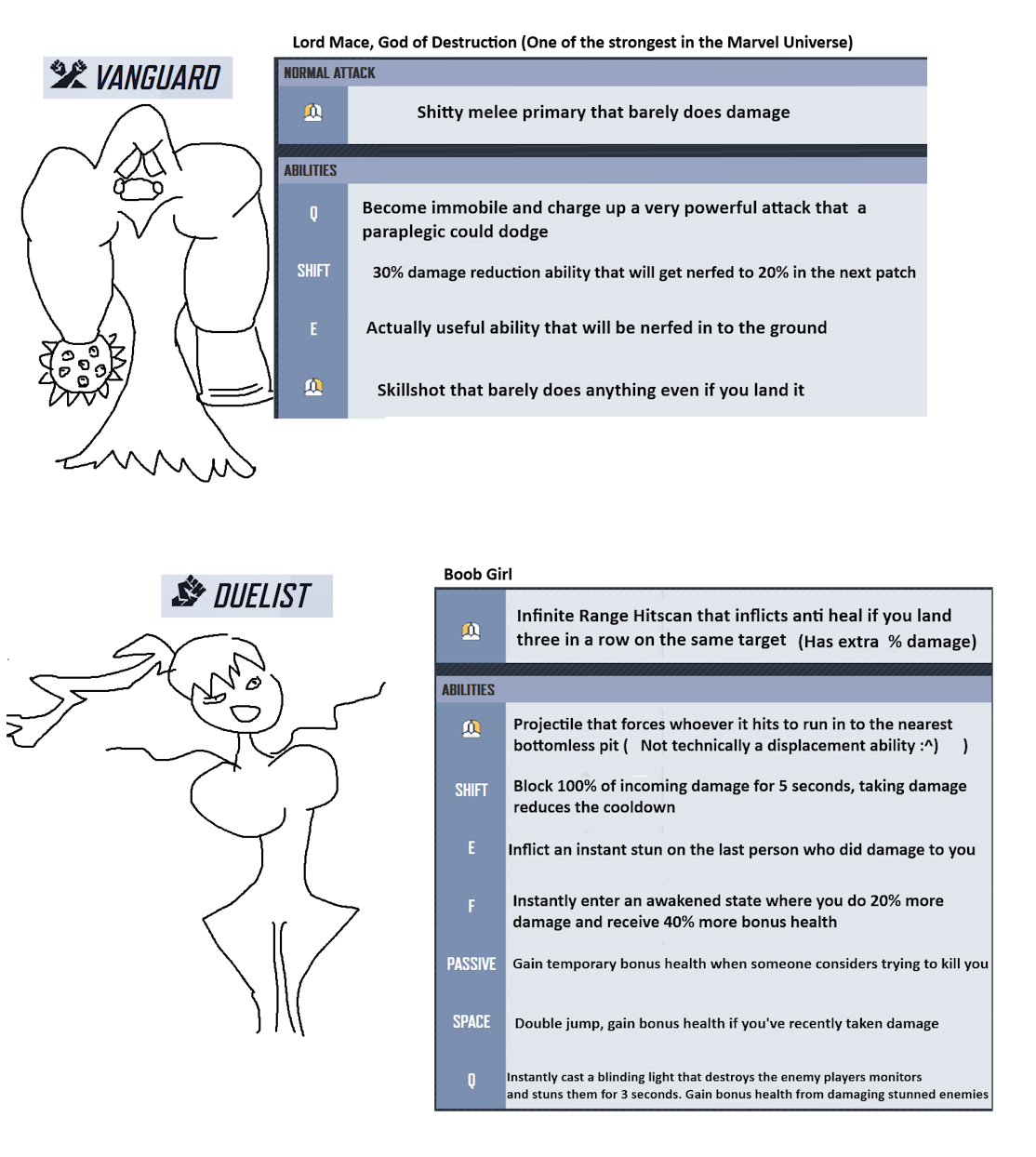 Hey guys, it's my dream to work at Netease as a gameplay designer. I've worked up to two character concepts for a new Vanguard and Duelist.What you you guys think?