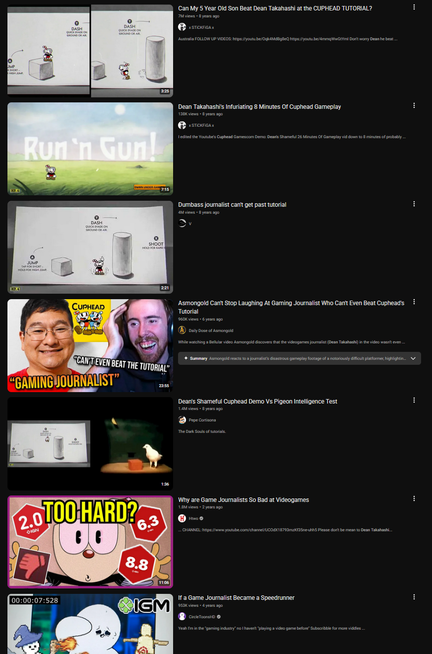 >>736987689Was it really like that? I don't remember Cuphead being the start of the 'journo difficulty' complaints. If anything, it was Souls games that got constantly derided because 'le git gud is toxic' and that's way before Cuphead.When the Dean video came out, I remember all the laughs and comparisons to 4yo using ipad/pigeon/whatever but I certainly do not remember him saying anything about the game being too hard.I think we're mixing up things here.