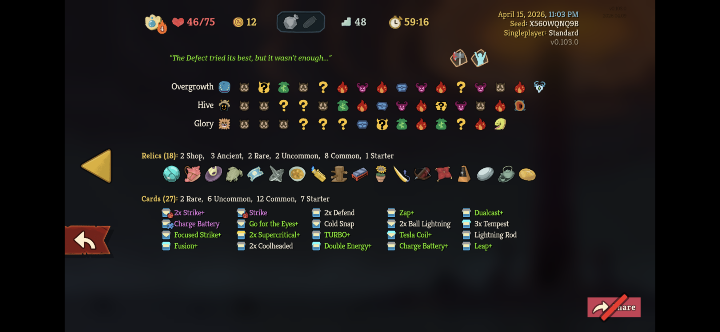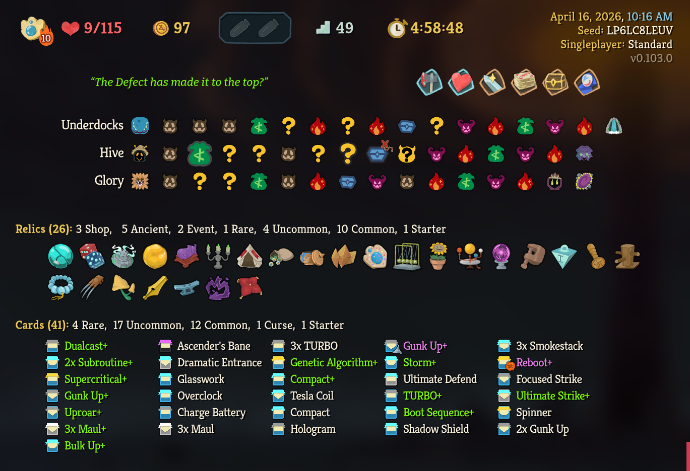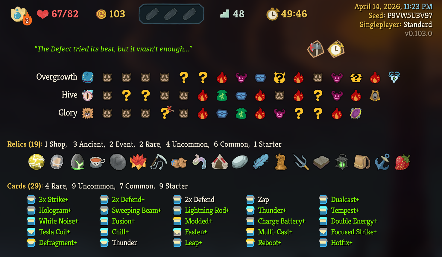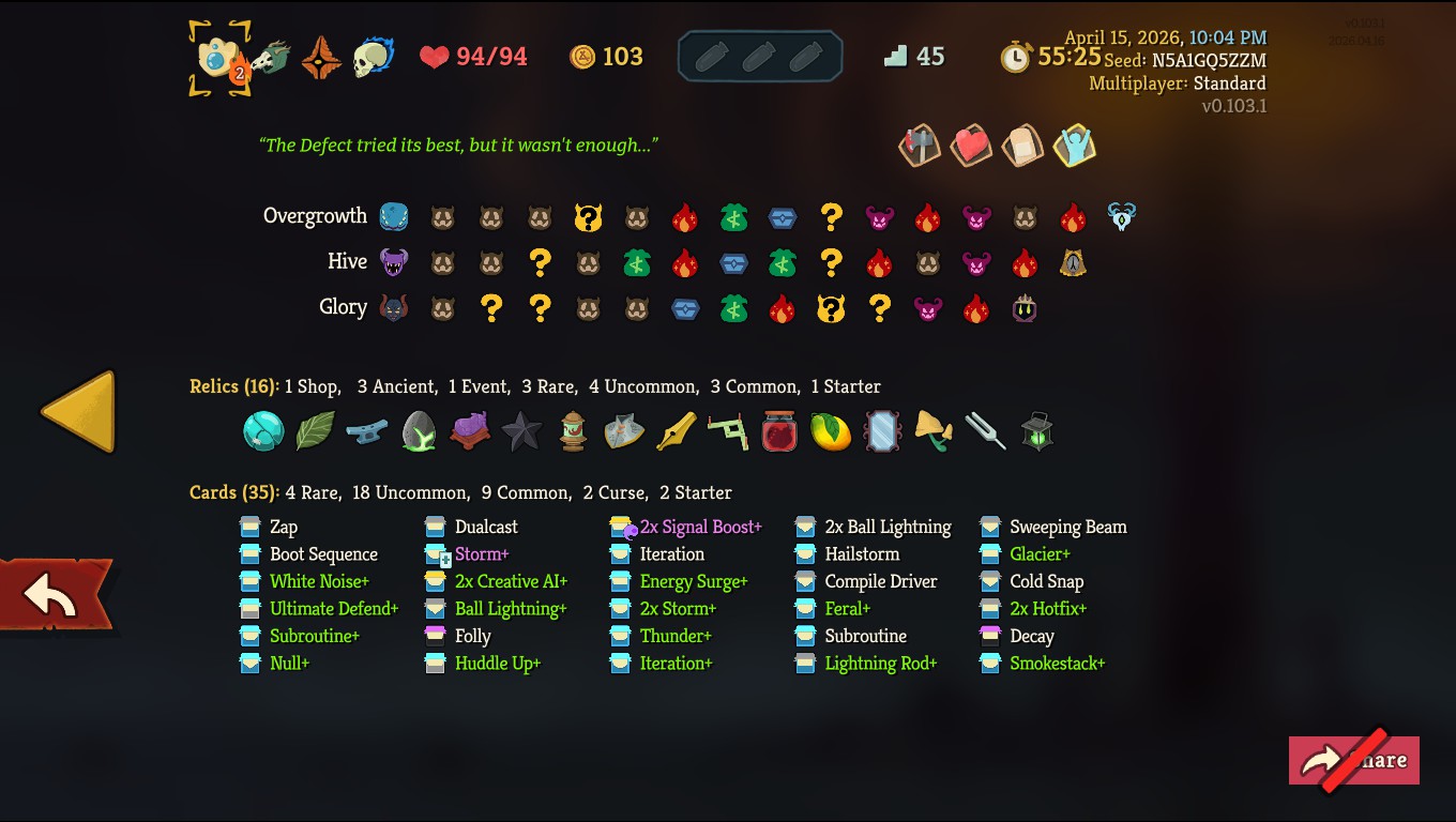 Check out this beautiful lightning deck I got on a break from Regent. Defect is super fun, but Regent is just a bit cooler, and I don't like having to grind ascension levels on new characters after I already beat A9/A10.