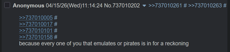 >>737010005>>737010017>>737010101>>737010158because every one of you that emulates or pirates is in for a reckoning