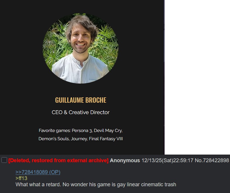 >>737061070That's not what anyone said. It's a huge problem that E33's legacy is "you're brown". It could have been known as a decent """indie""" JRPG, but instead it became known as the biggest industry plant and most artificially shilled and astroturfed video game of all time, by a very wide margin, whose entire online discourse consists of "you're brown". And it was the paid shills who made it this way, because for the first week or two, before the paid shills and bots and whatever discovered that 4chan was back up, White people could actually talk about the good and bad parts of the game with each other.