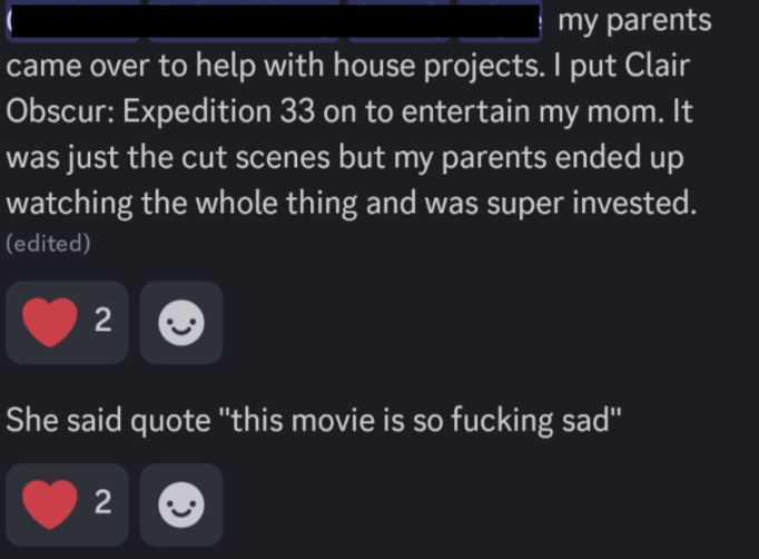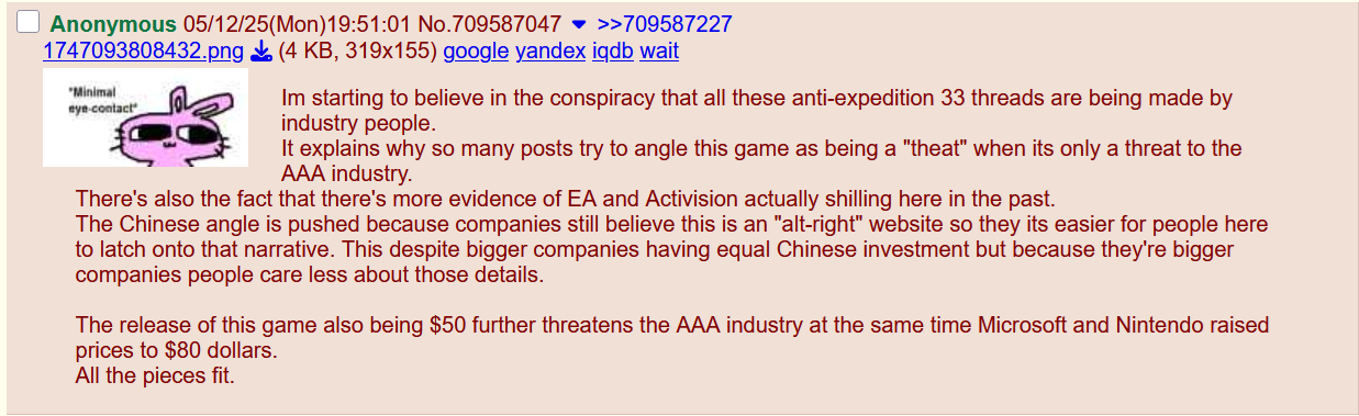 I can't speak for Crimson Desert since I've barely paid attention to it, but E33's popularity was basically entirely organic. Beyond the first trailer, there wasn't really much in the way of marketing at all. Initial players (like myself) tried it out of curiosity and were like "holy fuck this is good I gotta spread the word" and told their friends, who then told their other friends, and so-on.Then after a certain critical mass, people like OP latched onto it and started trying to frame the game as having some multi-billion dollar mossad shill campaign behind it or whatever-the-fuck these brain-raped outragesloppers concoct in the hollow cavern that is their skulls.Some people got a little annoying with the praise, sure ("durr finally a real rpg for mature adults with no anime teens!!!!" or "finally the first good jrpg!!!"), but you've just gotta separate the fanbase from the product in that scenario.