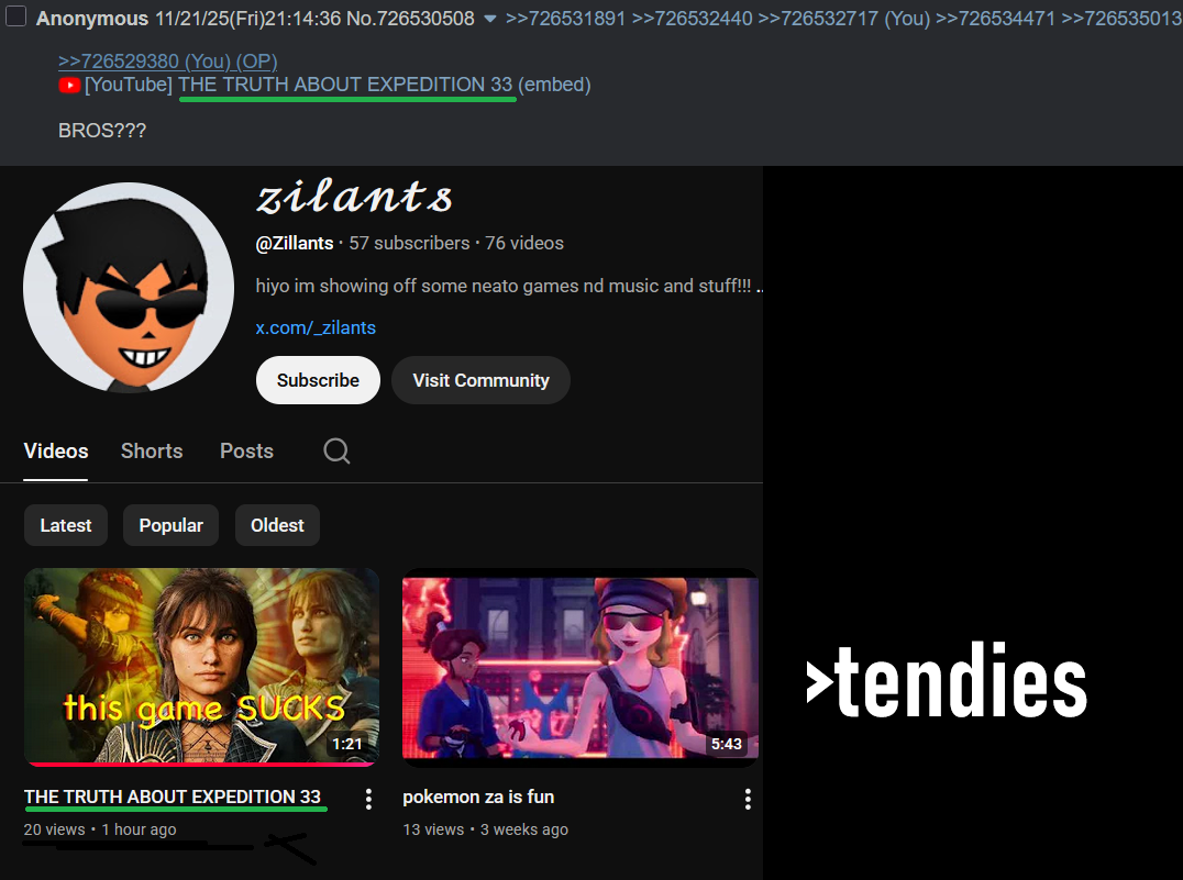 >>737058505>Your reasoning is backwardsIt's not. >Expedition 33 was released with limited fanfare, hype built up gradually after people started playing it and then rapidly snowballedNo, 4chan was down and it took a small little while for the bots to recalibrate or whatever, and all of June was massive shilldom, and beginning June 1st is abruptly stopped. >Crimson Desert was the opposite - multiple bump limit threads per day talking about the unreleased game which nobody here had played yet, and rapidly fell off once it was released. Sure. I just didn't notice any Crimson Desert shilling at all, which means that it was not even 1/100th of the shilling that E33 got. >You can have your own opinion about which of those patterns seems legitimate vs artificial It's more than that. I've never in my entire life seen 20+ concurrent threads 24/7 for the same one video game until E33 came along. It's the most shilled video game of all time, by a mile. By several miles, even. So it's just strange to me to see E33's shilling compared to Crimson Desert's shilling, when I didn't notice that Crimson Desert shilling was even happening.