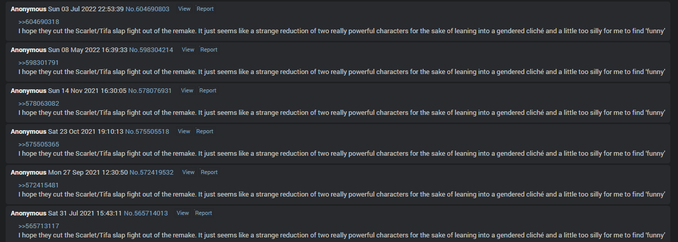 Love FFs but anons make it really hard to discuss them. I have a friend who's playing the classic FFs atm and it's much better to talk about the games with him than with anons dedicated to shitposting