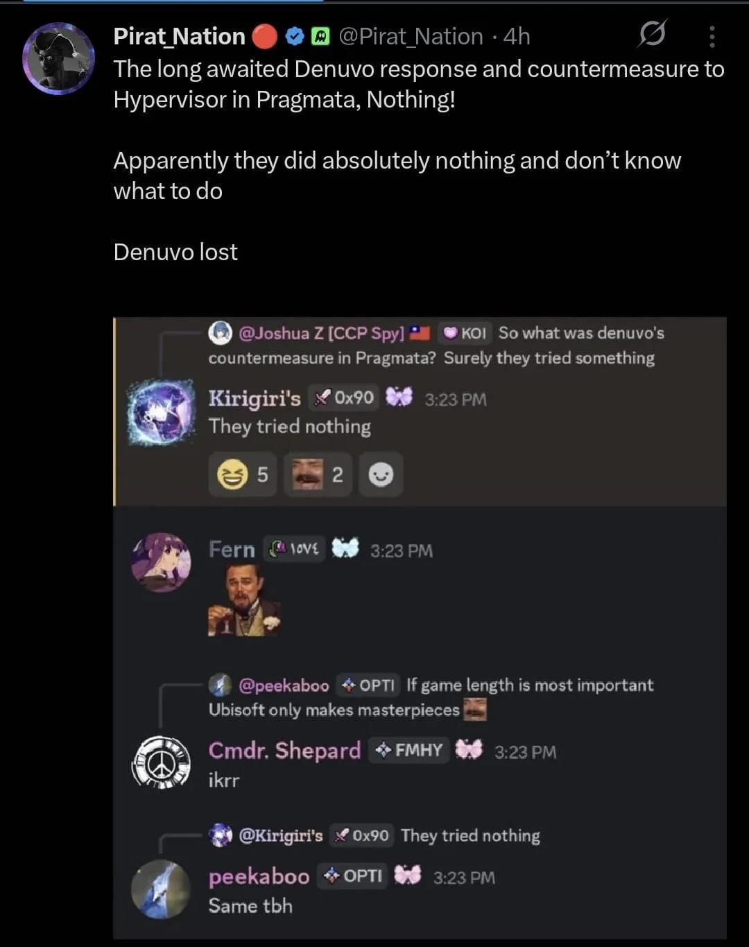 >>737053847either way though, paypigs LOST. pirates get the better version of the game, with more frames, and EARLIER than paypigs. this has been denuvo's and paypig's longest humiliation ritual