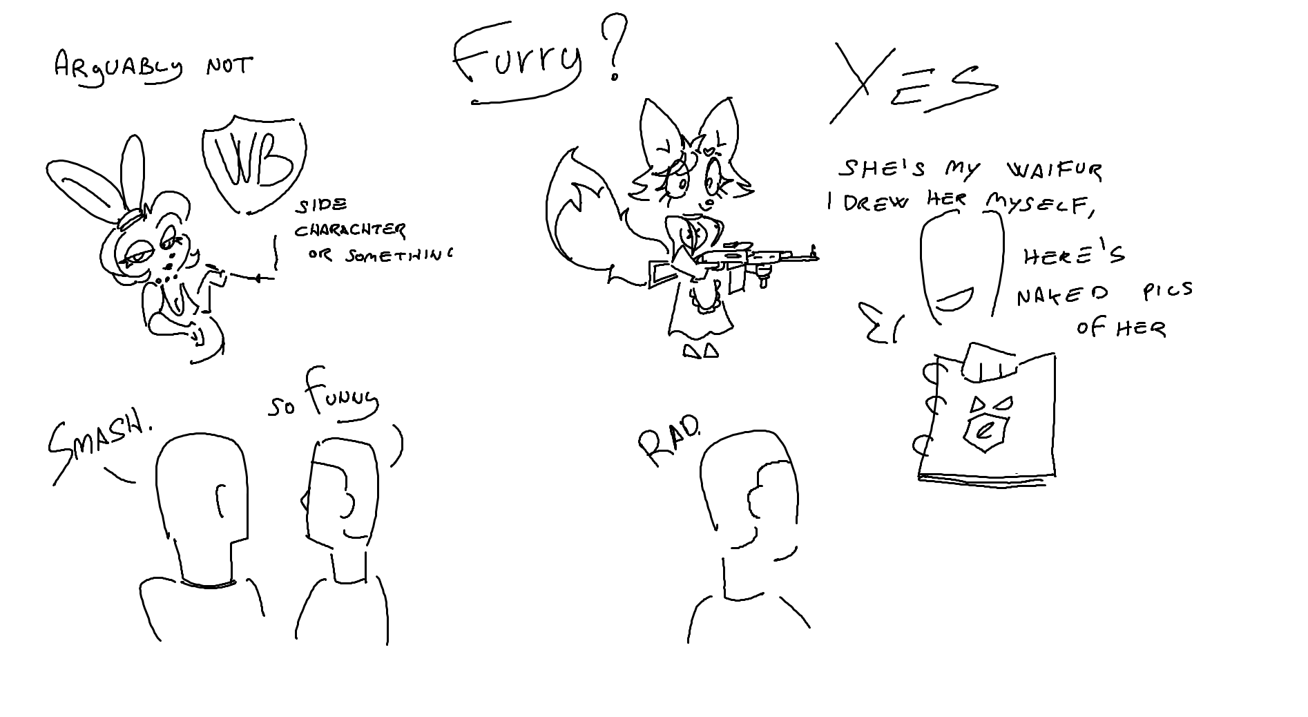 What the fuck were we supposed to do? We were outnumbered at least 99 to 1 and trying to find anyone who wasn't a nutcase was a futile endeavor when any furry community would've just instabanned us at the first mention of what we really thought of them all.