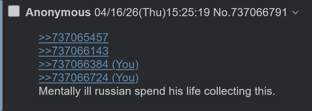 >>737065457>>737066143>>737066384>>737066724Mentally ill russian spend his life collecting this.