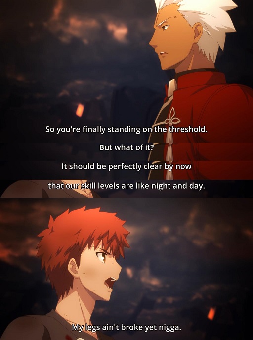 I thought UBW was by far the weakest constantly rehashing the same "muh ideals" shit we already went over in fate except for kino hype moments