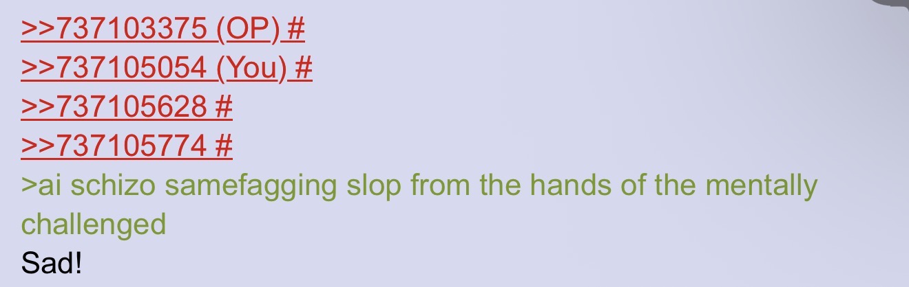 >>737103375>>737105054>>737105628>>737105774>ai schizo samefagging slop from the hands of the mentally challengedSad!