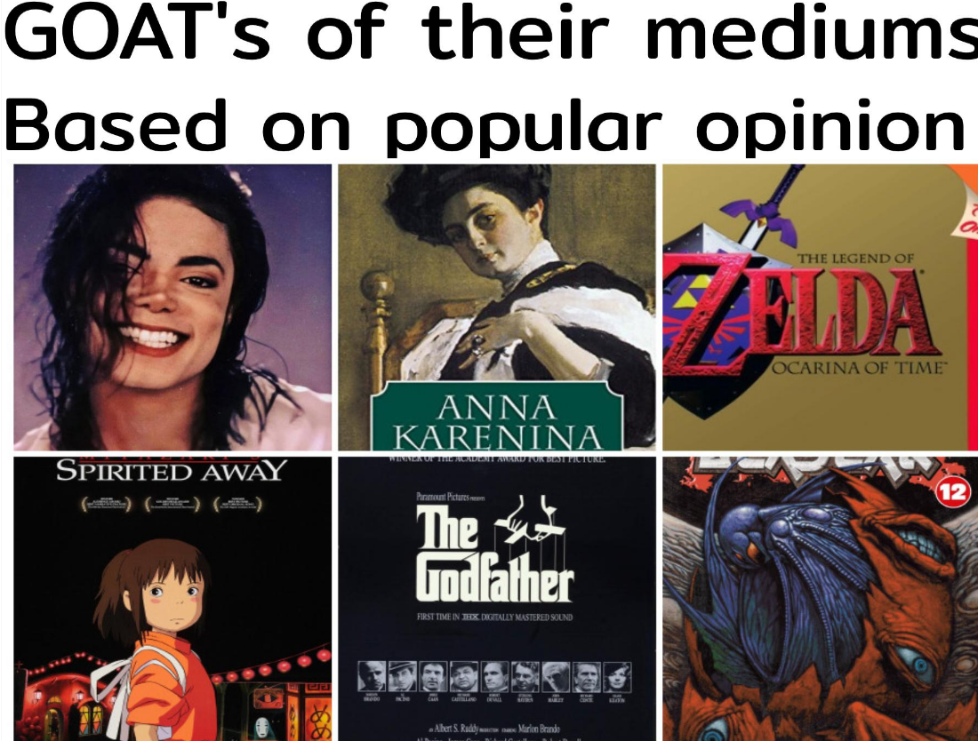 >MusicProbably something classical. Michael Jackson was popular and had a great voice, but he was hardly the best. >NovelUlysses or Hamlet.>GamePublic opinion would say something like Super Metroid or GTA SA. Personally I’d say DMC 3.>TranimeEvangelion>FilmThe Godfather is a classic and I don’t mind that pick, but I prefer Italian neorealism. >MangaBerserk fell off a cliff after conviction. If you had to pick an unfinished edgy seinen, Vagabond is better.