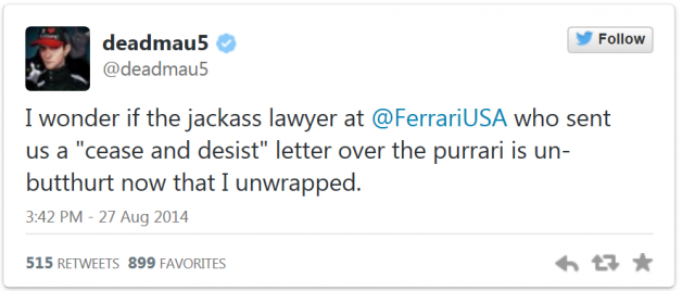 >>737121192Did people forget when Deadmau5 got a cease and desist from Ferrari lolhttps://www.stites.com/resources/trademarkology/deadmau5-gets-in-trademark-catfight-with-ferrari/What's allowed isn't so black and white