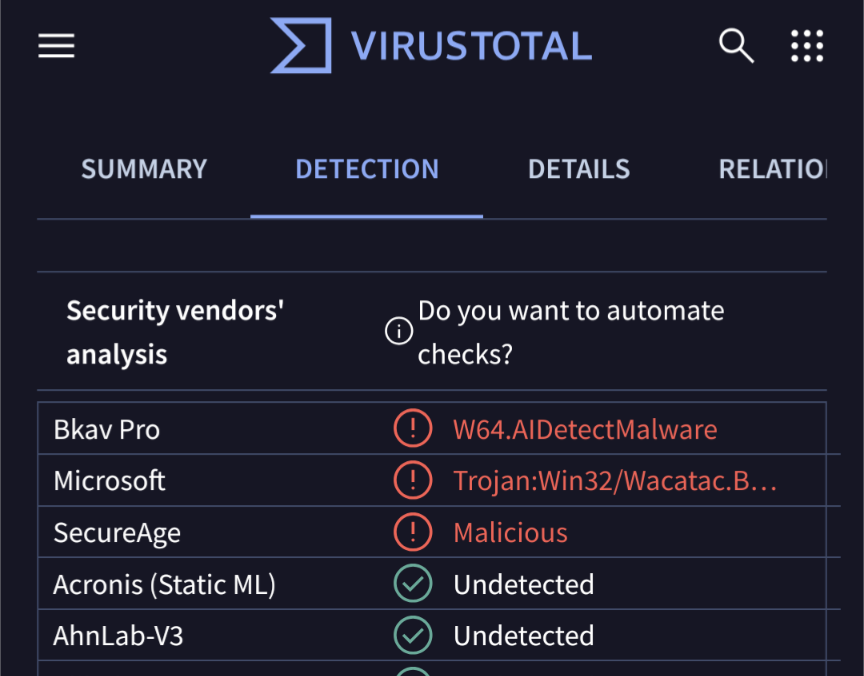 https://www.virustotal.com/gui/file/35909b659dc31a81fc15b9f432317d12f14ef33d63eeb87b8142e81f98da527e/detection