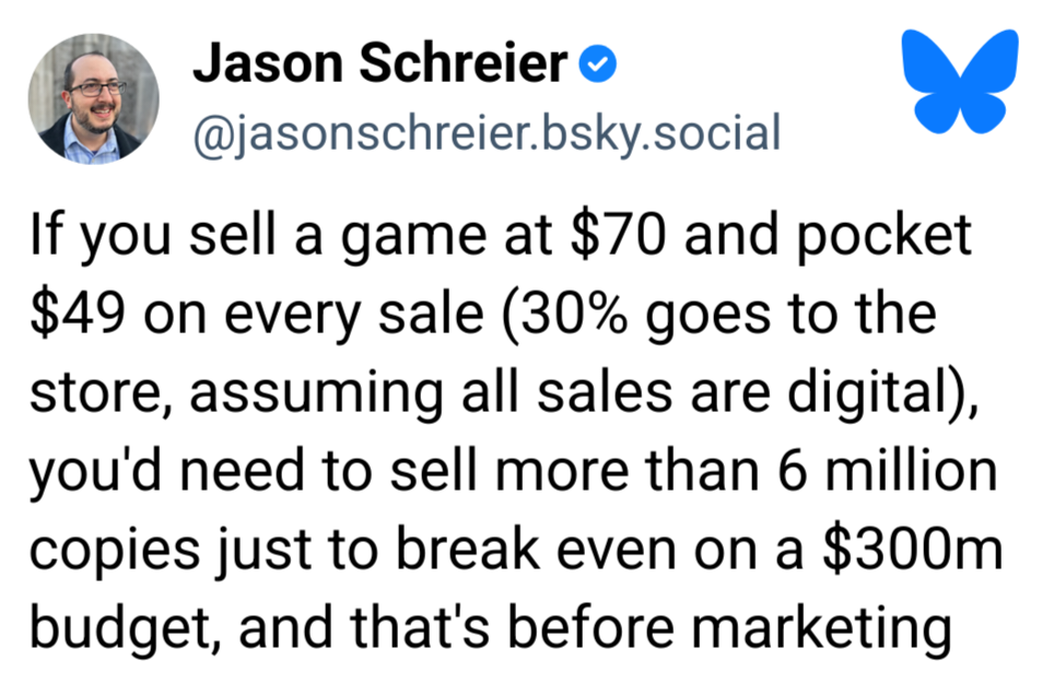>>737126697>$300 million budgetFound the problem. Games should not cost millions to make.