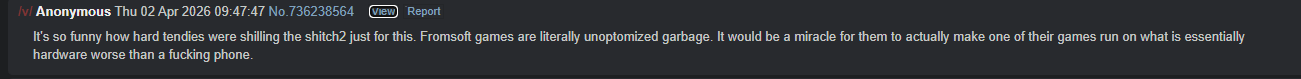 PS6 handheld fanfics, "Who cares if the PS5 doesn't have games! Sony is making so much money because of GTAO!" cope, "Shitch poo can't run elden ring". The same melty as usual