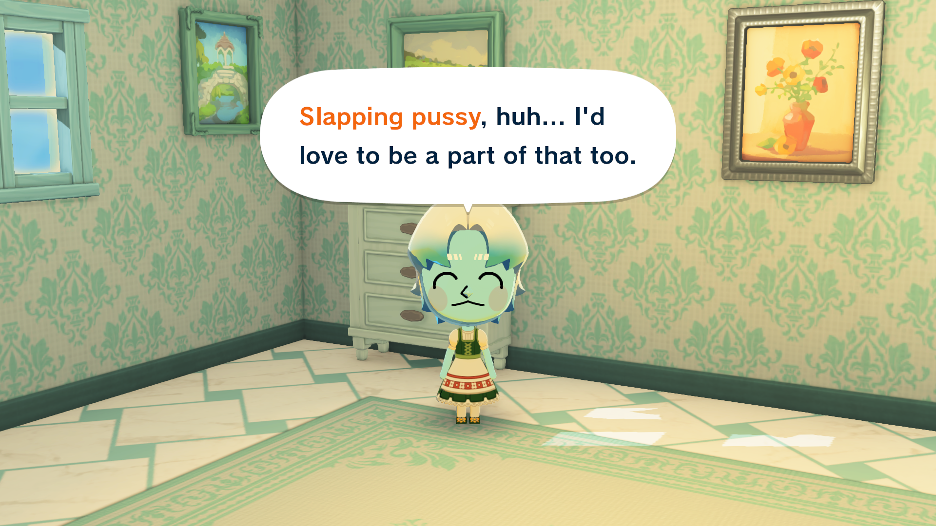 I love how if you pick the "greets with a curtsy" greeting they actually lift up their dress if they're wearing one it's really cute