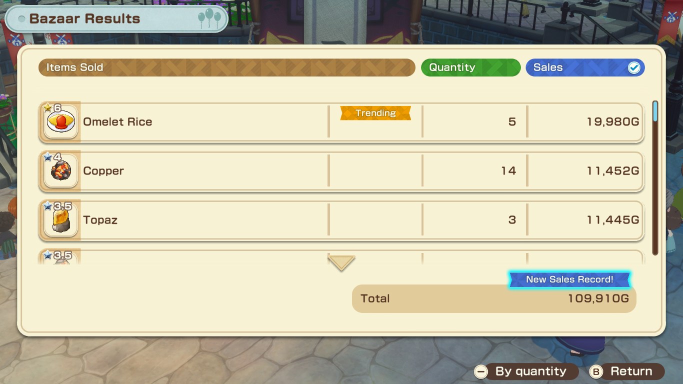 >>737161403Gems are RNG and limited so it's not consistent. Improving your animals while having a bunch of them allows you to shit out high quality food. If you do your sales right and get a boosted theme for your bazaar and time your sales right it's big money.