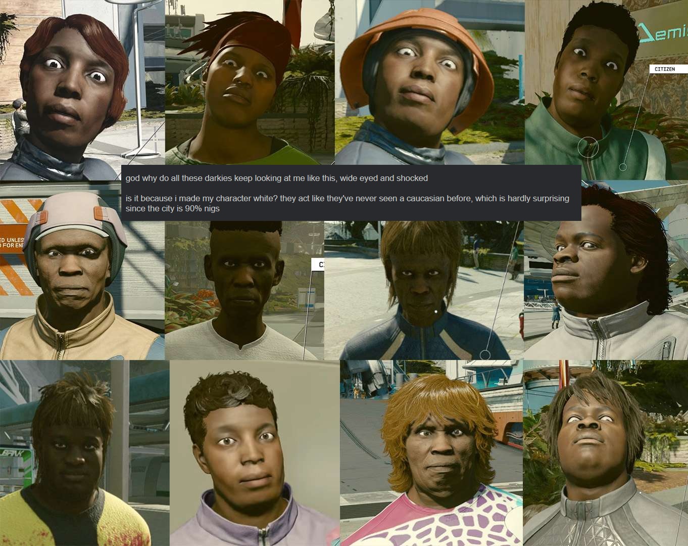>>737183582>How in the world can somebody design npcs like that with a straight faceThey weren't designed. The NPCs are all done by a random face algorithm, that for "some reason" is heavily weighed to make everyone black and ugly as shit.