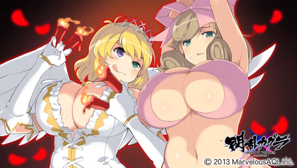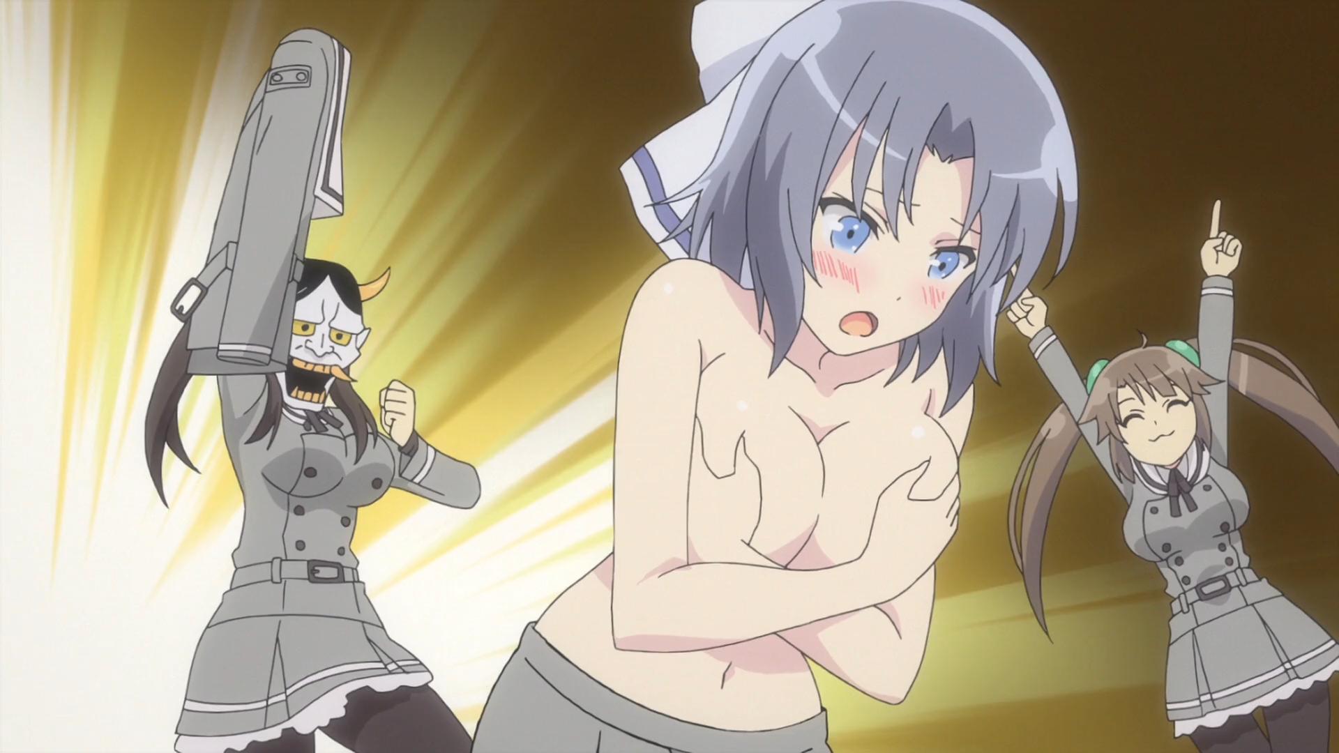 Multiple non-explicit images of topless Senran Kagura characters covering their breasts, here I go!