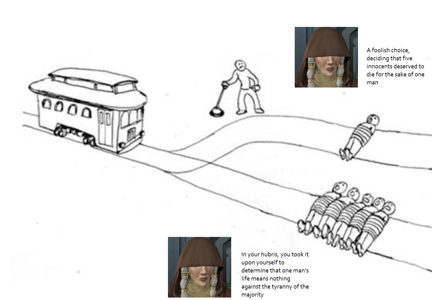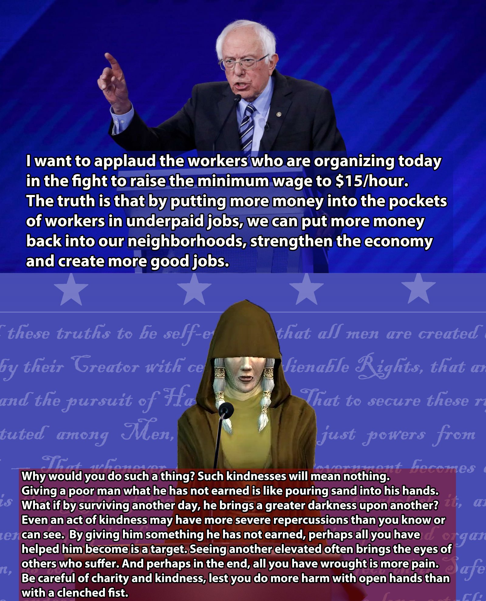 >>737176756Kreia wasn’t able to destroy the Force and she also wasn’t able to convince the council that they were wrong, which is why she kills them in a fit of rage (are if you choose to kill the masters yourself, then that denies her her goal even more). Kreia was fighting an unwinnable battle, and despite her claims of not being Sith, she still uses Sith tactics like manipulation and lying. In the context of the Star Wars’ universe’s morality, she was no different from Sidious in the sense that she was a hypocritical snake who was defeated. The Force won against her just like it won against Palpatine.
