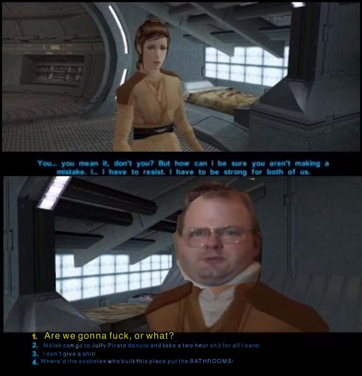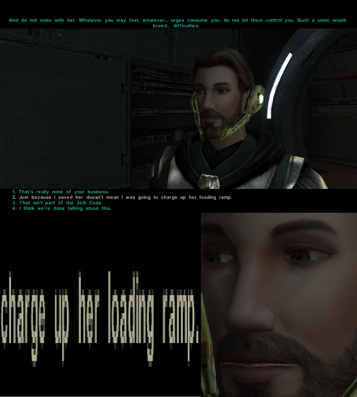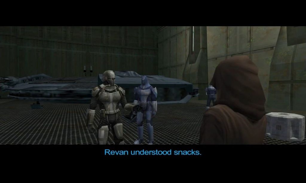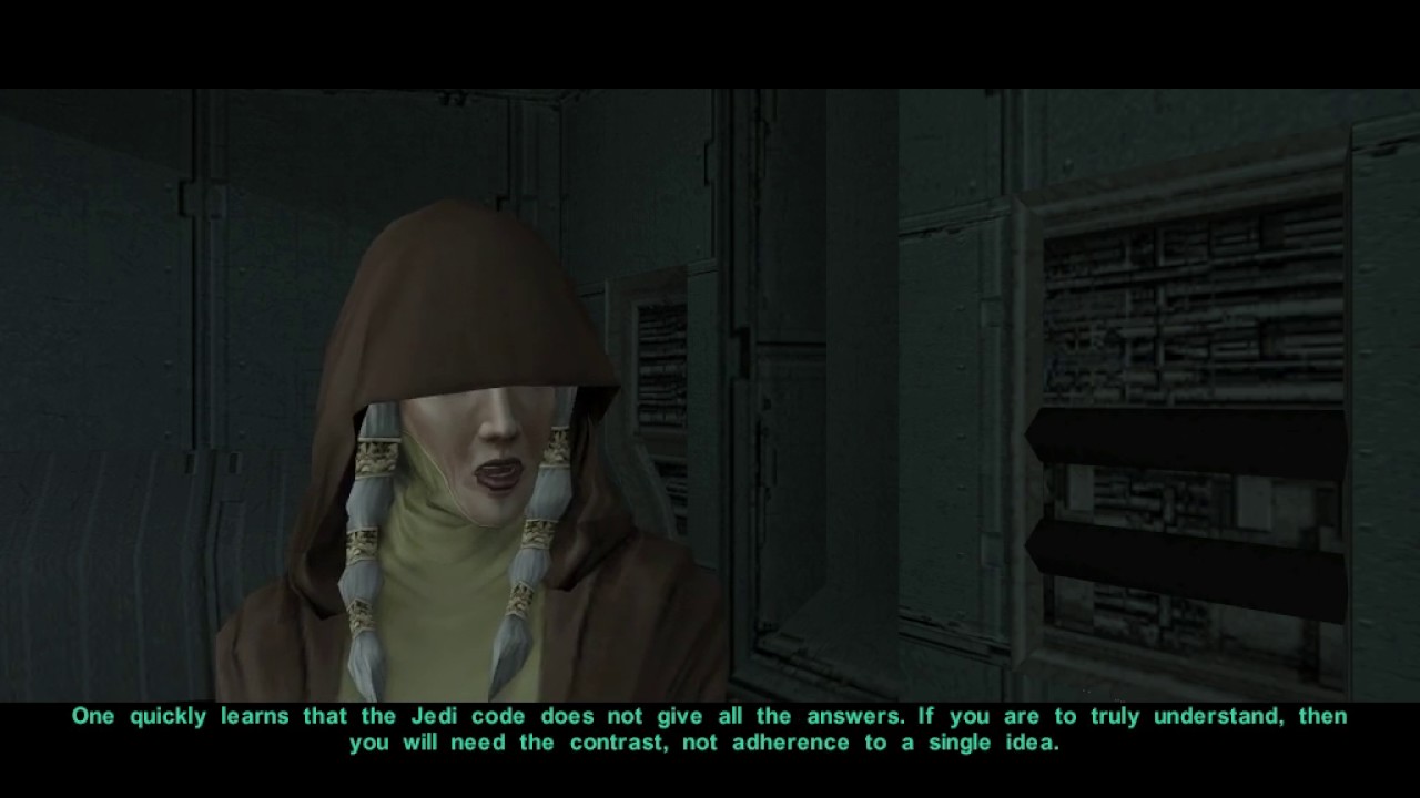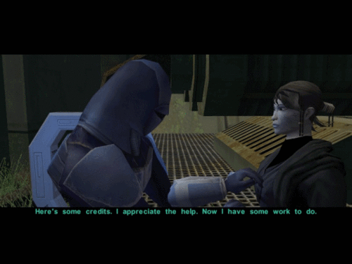 >>737166437I constantly flip flop between kotor I and II being my favorite because of things like this
