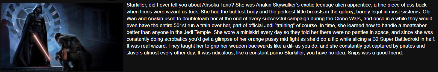 >>737162193>Darth Vore, he could consume the whole galaxy, but he couldn't stop his sub goth girlfriend from banging the exile.