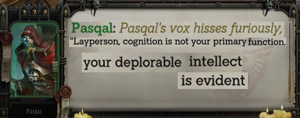 Bringing a tech-priest to Trazyn's museum is a no brainer but why did I need a second one? Pasqal has what it takes to be the worst museum guest ever, he doesn't need any help.