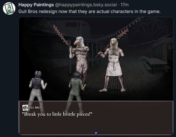 I'm not sure if it's a boss or just some stuffing for the new Rher dimensions but yeah it looks goofy. The new Old Town Mob is nice, and makes me scared for how the intro area will play out post update. I think update gull bros are a downgrade too, they used to actually be like crow maulers with seagull heads but now they're just dudes in brid masks.