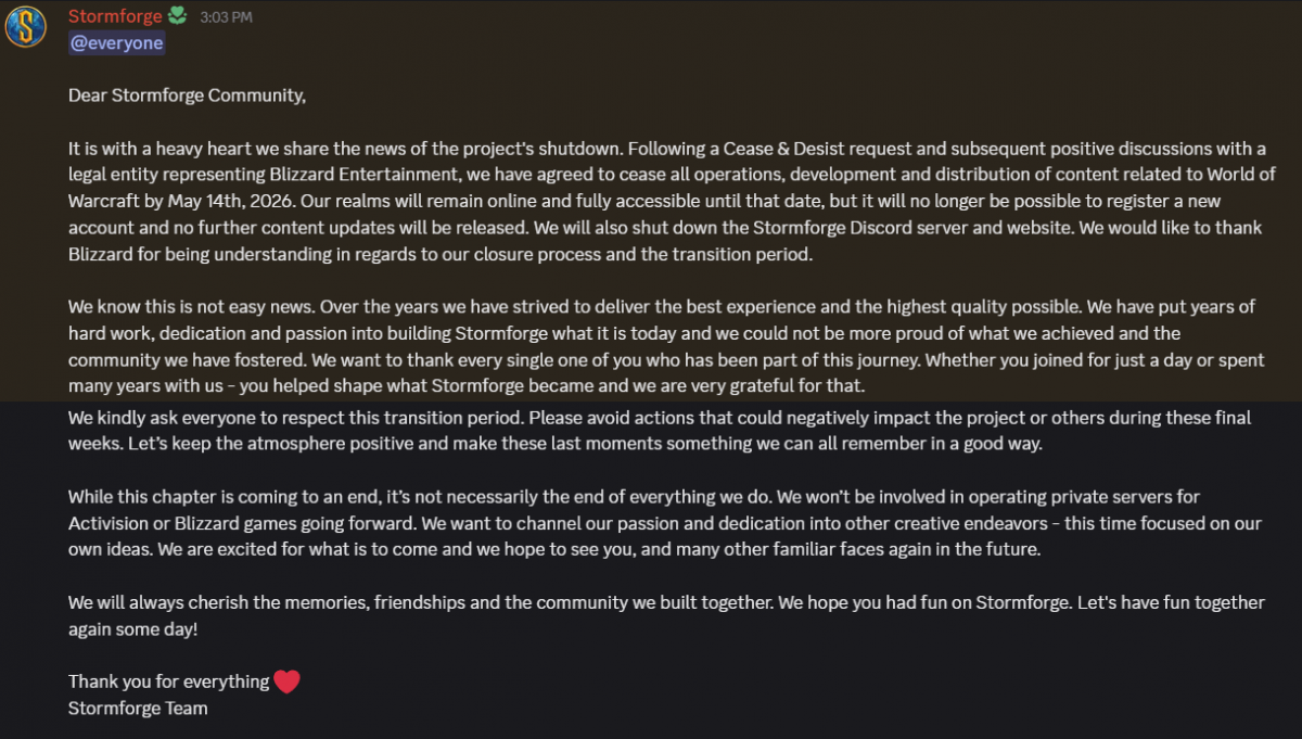 This is actually a huge win for Blizzard cause they're releasing Classic+ probably sometime next year and now they'll have no serious private server compeititon for it