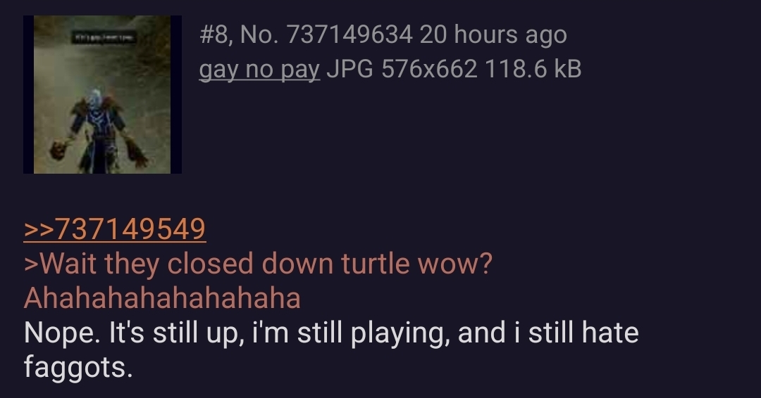 >>737185502>>737185734>TurtleWoW was totally overrun with trannies, trust me bro>just ignore the fact that retail WoW panders exclusively to those clowns>>737185648>you're an indian for saying something negative about a company owned by MicrosoftThe fuck even is this projection?