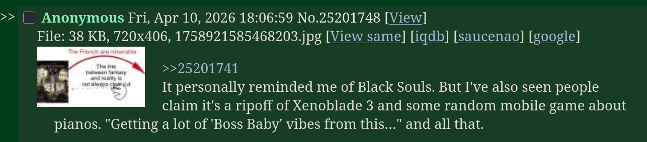 >>737200370Oh I never made the connection between E33 and BSI/II. (Dead Red Hood when) following the thought the Writers could function either as another garden (rival to the painting worlds) or potentially as a grand guignol style time repeaty thingy. (the Dessendre's are trapped in some sort of bullshit like Grimm) (In addition to the usual view of them being meta commentary on the literal writers of the game.) I wouldn't expect Sandfall to allow anyone to ever say a single thing about Black Souls even if it did inspire parts of the story; that would be bad for biz.>>737200568I would absolutely believe he's a /v/tard, I'd say a large chunk of people deeply into japanese vidya in general probably use 4chan. (weirdly enough 4chan, the internet hate machine, may be one of the least hostile places to japanese media.)Actually, now that I think about it, E33 might be a pretty good piece of 'otaku media' in the sense that it is extremely heavy on references/allusions to other games.