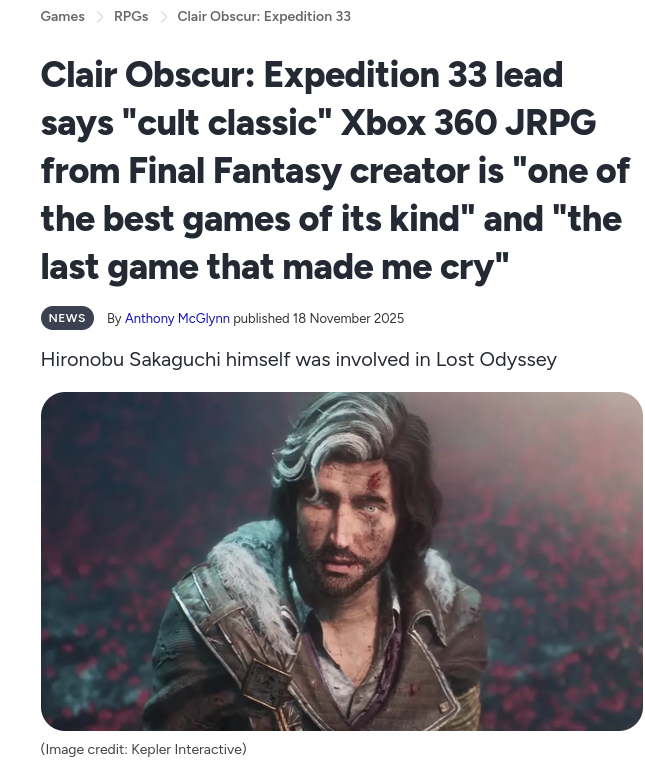 >>737202008>Even in the e33 fanbase there are fags who claim that it's better than all Japanese mediaI wouldn't take those posters seriously. Maybe outside of 4chan, but here it's 99% bait or falseflagging. People who made images like pic related are also the type to hate all modern vidya (just look at the BG3 seethe), and they certainly wouldn't touch something so inspired by JRPGs.