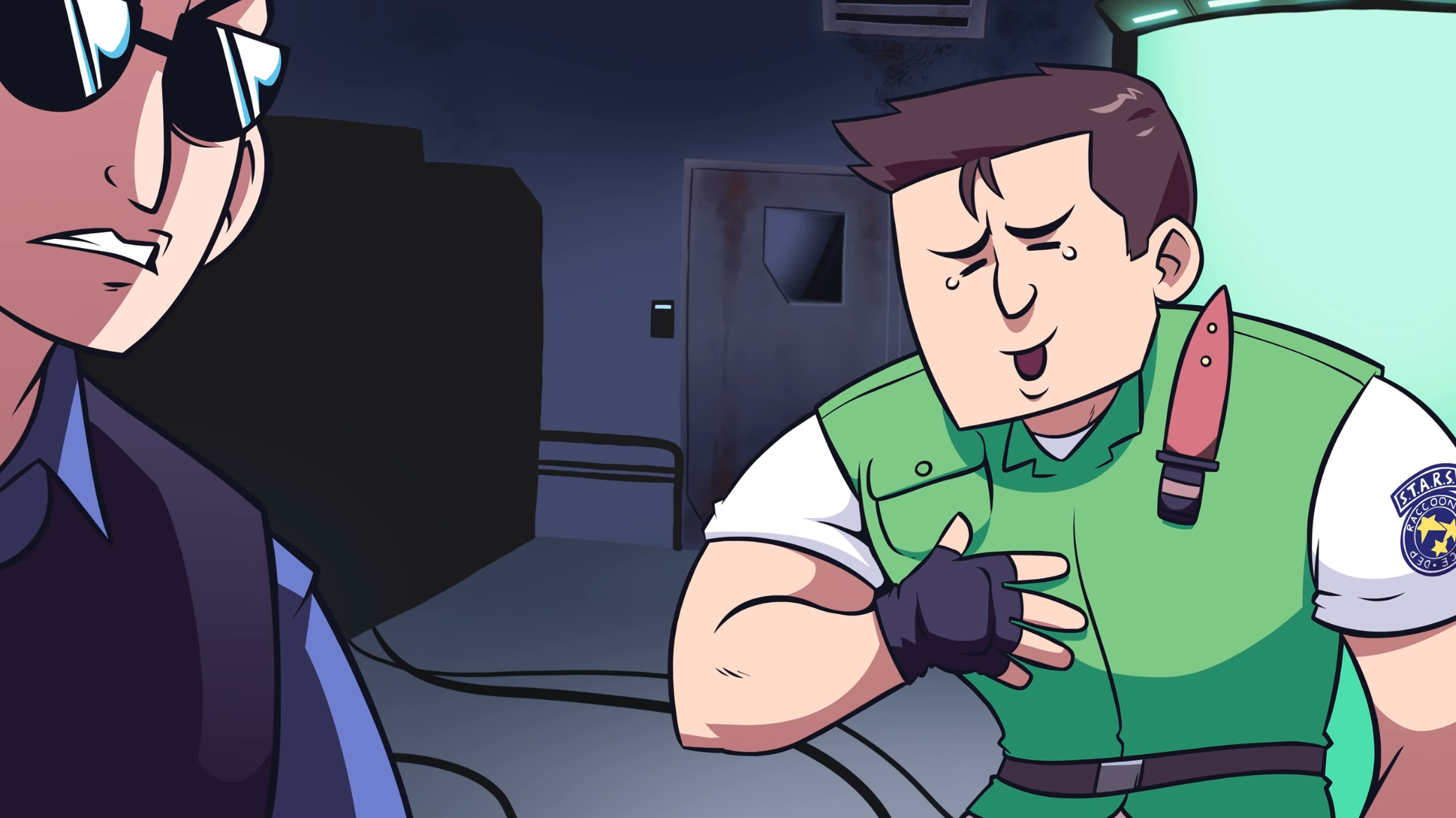 >You see this corny asshole using shades indoors who is selling out his team to a bioweapon company for cash? Oh yes, he is actually the prototype of a new race of humans that will inherit the earth once we destroy it. The T virus we created in here was designed to let him become a god that will lead his race of Weskers into world domination