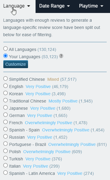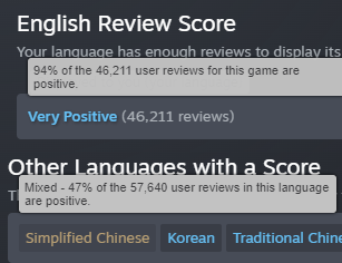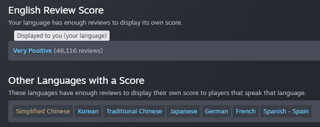 They're doing something very wrong when Spanish isn't Overwhelmingly Positive. Latinxos have no taste and will rate everything 10/10.