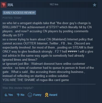 I think Chinese people shouldn't be allowed to review games. Remember when Monster Hunter got reviewbombed because a guy in the MH movie rhymed knees with Chinese?