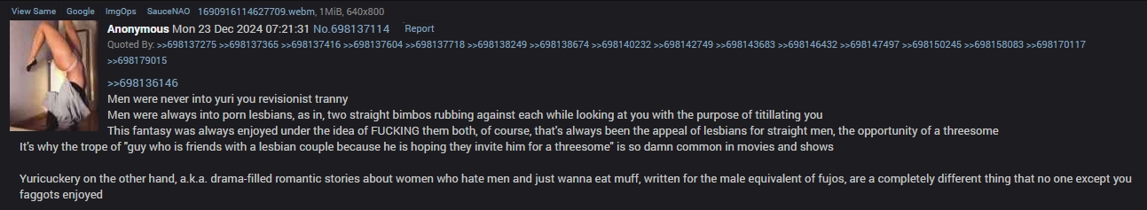 >>737265263I may be wrong but I think it's a reaction because lgbturds are "claiming" yuri is for them and it attracts them which usually causes havoc in the community