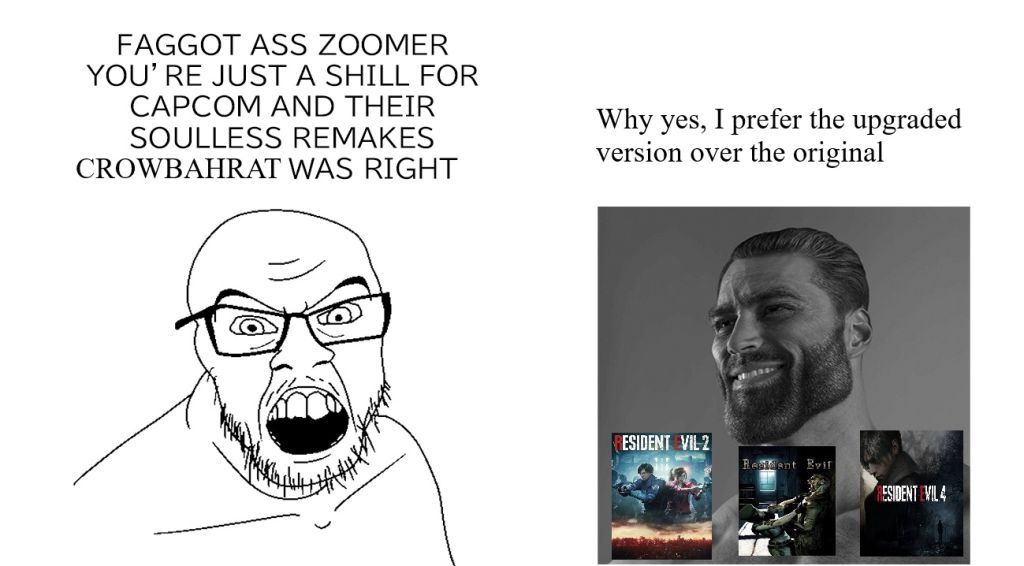 I said it before and I'll say it again I'm convinced that a person who never played any RE title before, whether an unc or zoomie, tries RE4 og and then RE4 remake back to back will prefer the remake. When you remove the childhood nostalgia glasses and judge the games purely on their merits more people will prefer the remake, 9 times out of 10. The game may have been good for its time but the die hard fans who insist it's better than remake seem to be exclusively people who played it in their childhood either with friends or siblings and have fond memories associated with it.